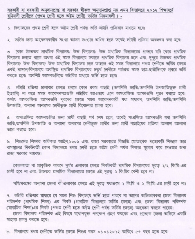 Admission procedure in elementary classes (from class-I to class-VIII) in Govt. run school or Govt. aided school or a Govt. recognized but unaided school for the academic session-2012.