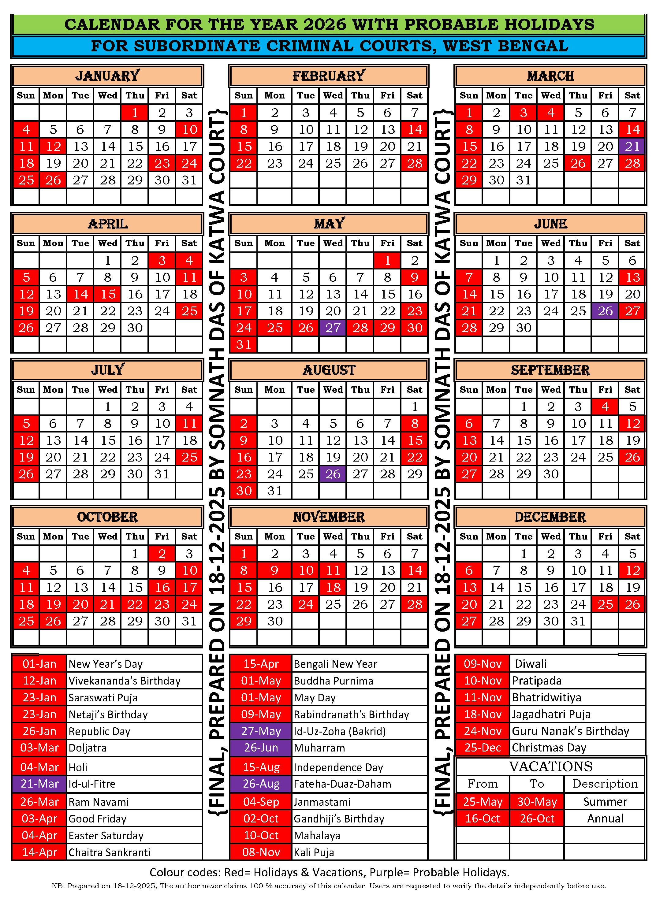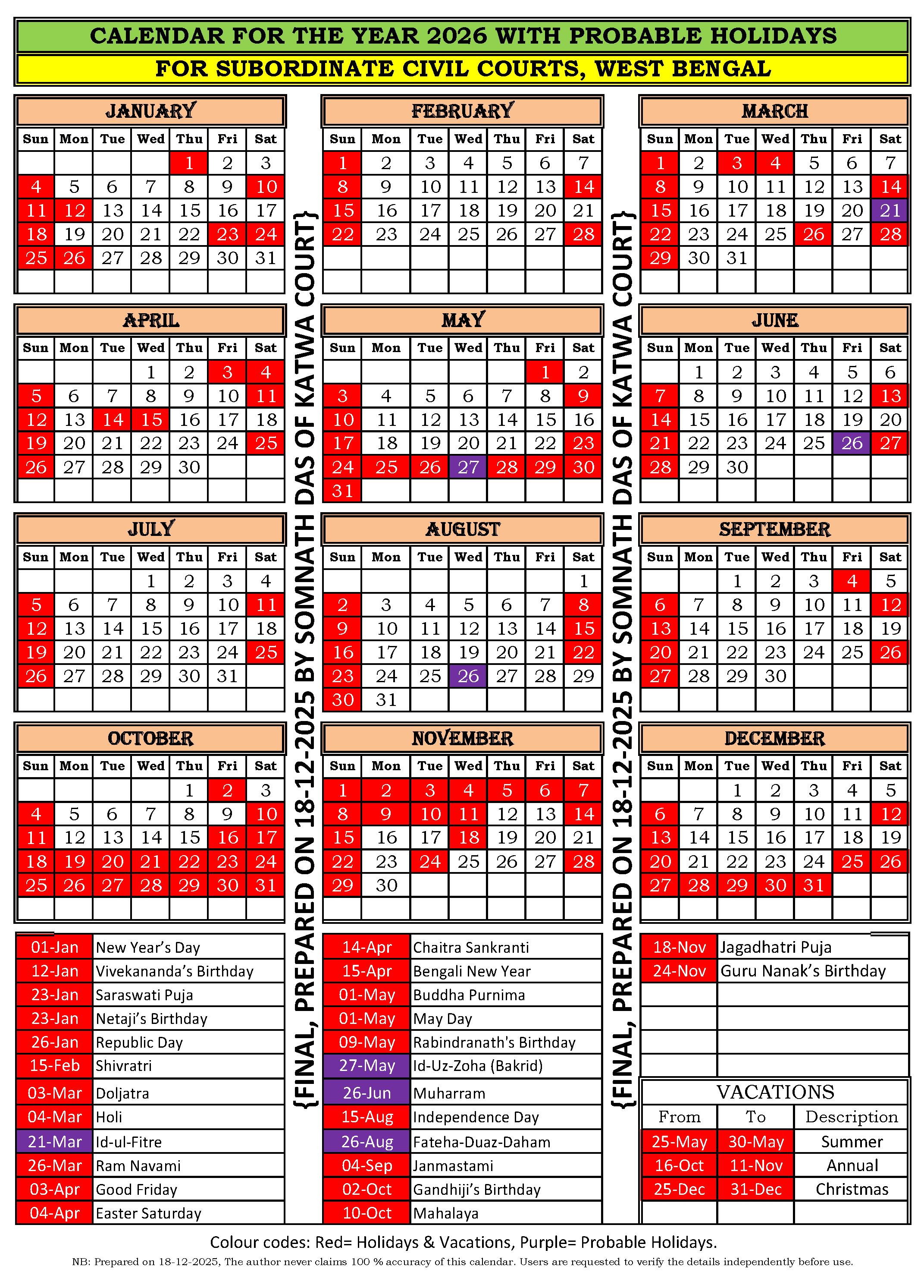 Calendar for Sub-Ordinate Criminal/ Civil Court for the year, 2026