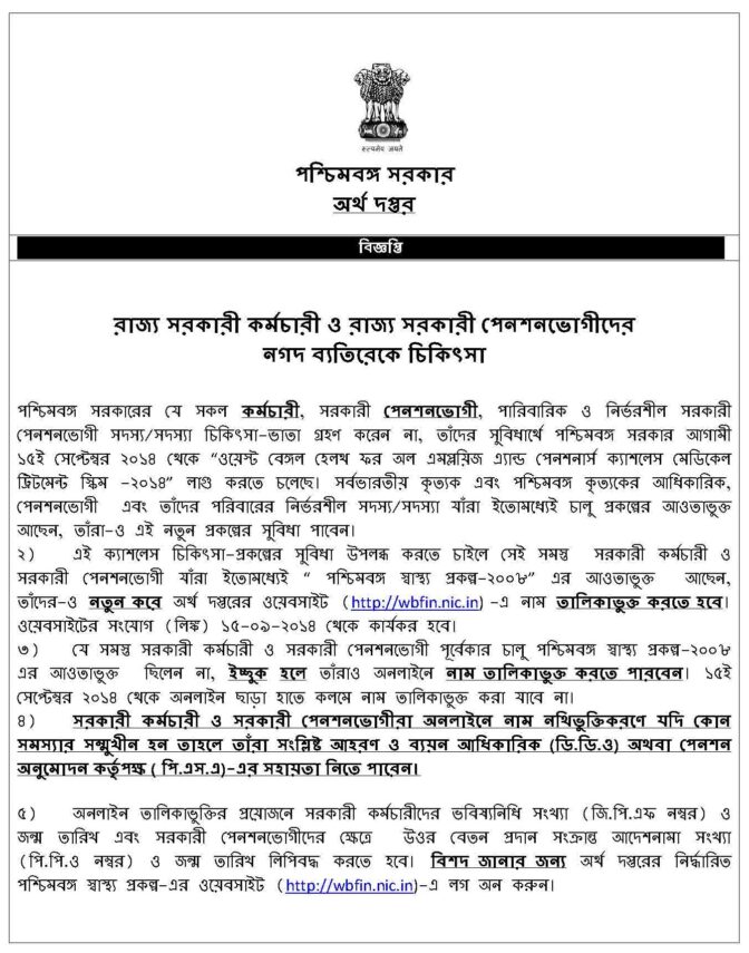 To avail the benefit of the Cashless Medical Treatment under the Scheme, a Government Employee or Government Pensioner already enrolled under the West Bengal Health Scheme, 2008 shall have to enroll afresh through the link West Bengal Health Scheme provided in the Finance Department’s website http://wbfin.nic.in. The link will be operational from 15-09-2014.