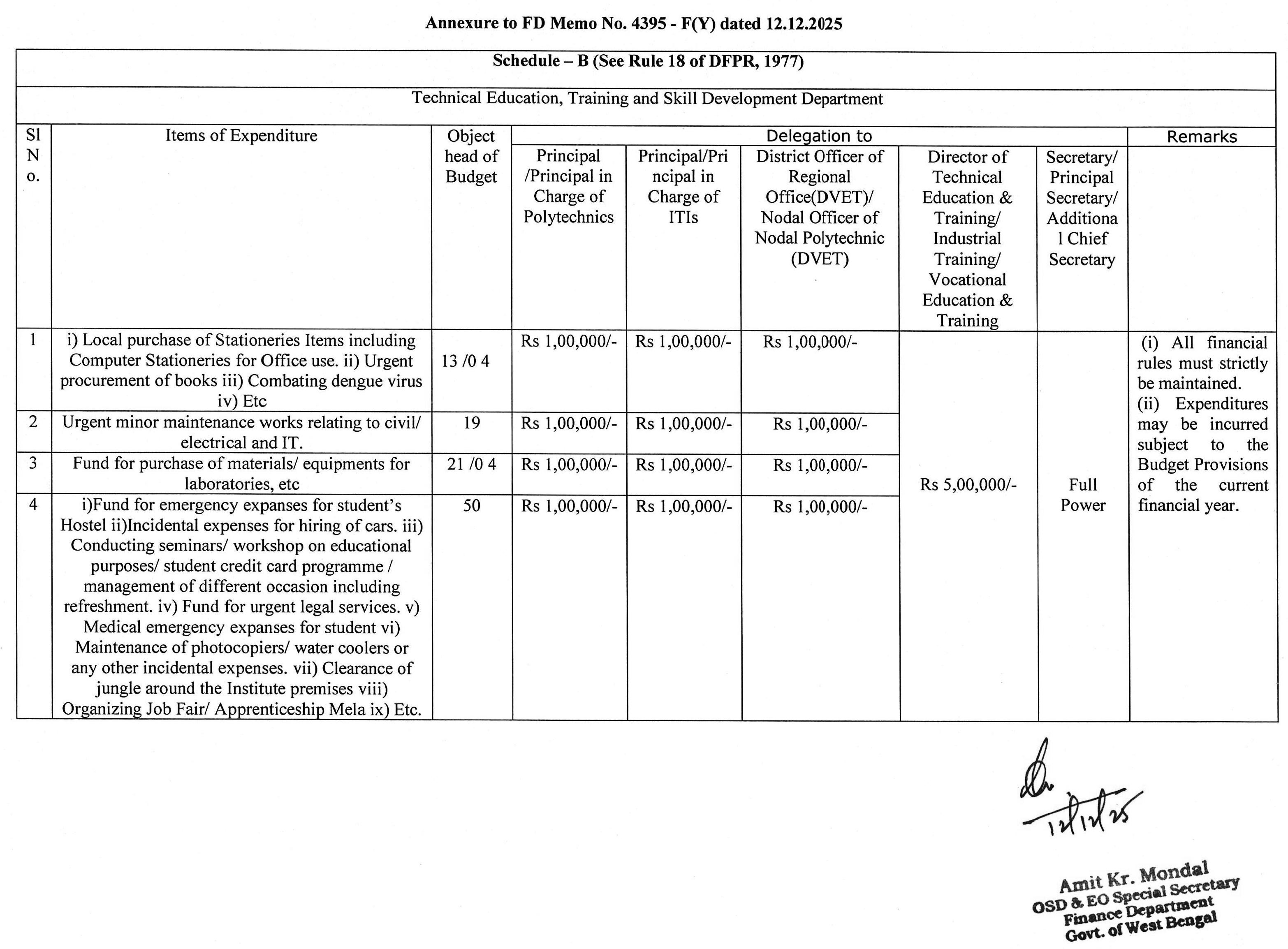 In continuation of this Department Notification No. 4411-F(Y) dated 04.06.2015, the Governor is pleased to delegate financial powers to the hierarchy of the officers under the Technical Education, Training and Skill Development Department, Government of West Bengal, as per the Annexure enclosed, for inclusion in Schedule B annexed to Rule 18 of Delegation of Financial Powers Rules, 1977.