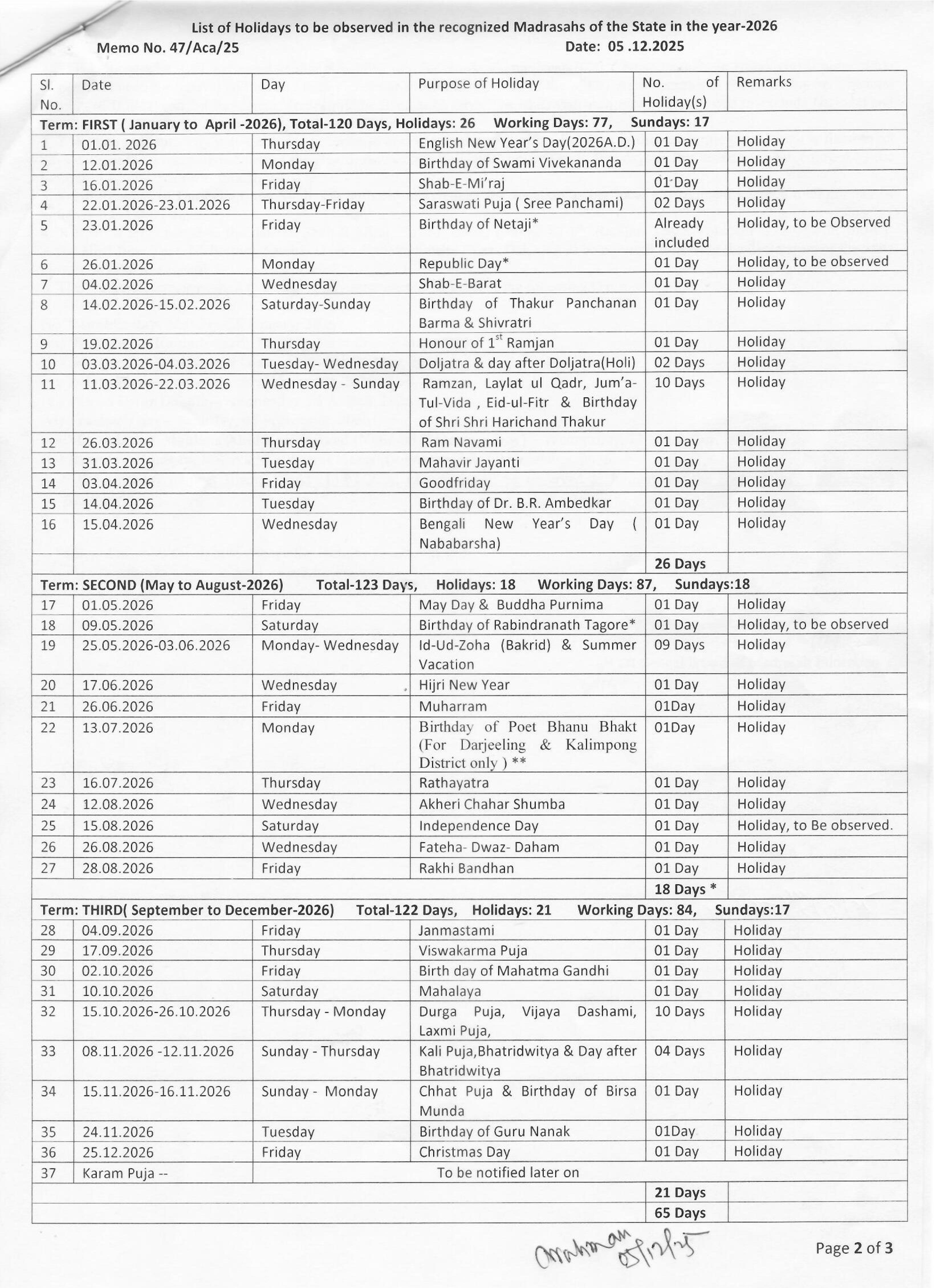 In exercise of the power conferred by clause (e) of sub-section (2) of section 20 of West Bengal Board of Madrasah Education Act, 1994 and as per decision of the meeting of the Board held on 17.11.2017 and as directed, the Heads of all recognized Madrasahs are being instructed to follow the List of holidays – 2026 (specimen list of holidays) attached herewith. It is to be noted that the maximum numbers of holidays to be observed for this academic session will be limited to 65 days.