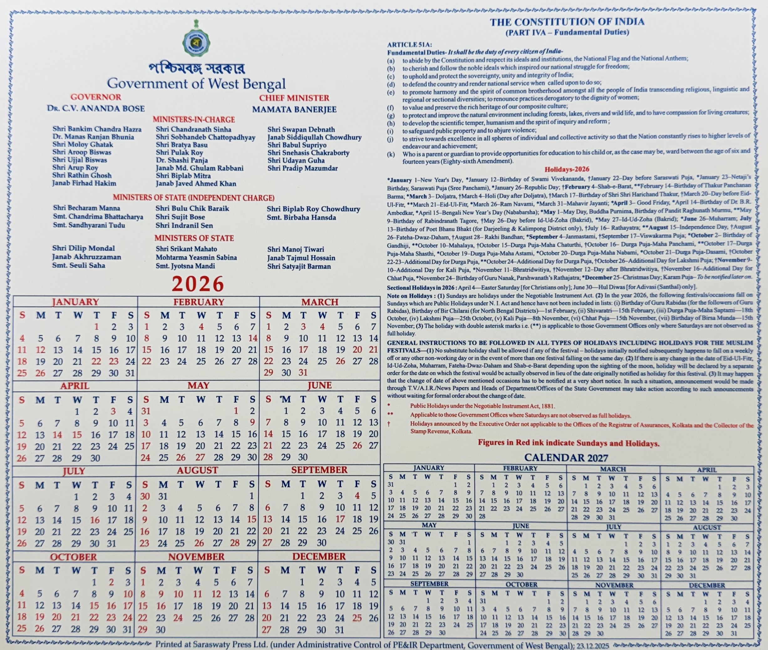 (#) It has been decided that the birthday of Bir Chilarai will be observed as holiday for North Bengal Districts. In 2026, the date falls on 1st February, Sunday, which is a holiday under N.I. Act and therefore not shown separately in List II.