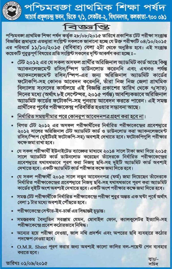 In continuation of our earlier notification dated 28.08.2015, it is further notified for all concerned that the TET Examination due to be held on 04.10.2015 is rescheduled on 11.10.2015 (Sunday) from 2:00 pm. The attention of all concerned is drawn hereby to the following important points:-