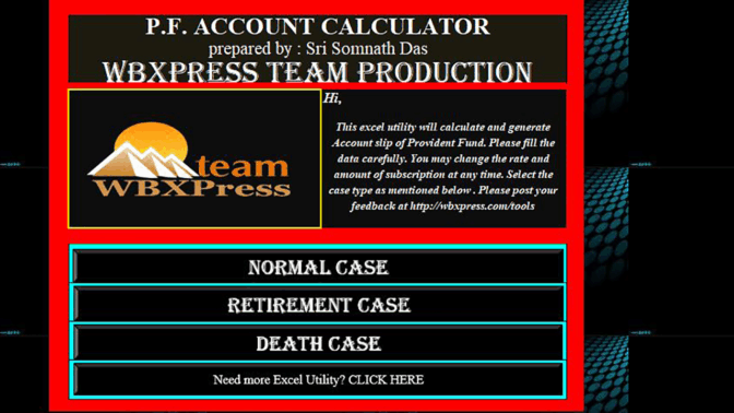 This Excel Utility will calculate and generate Account Slip of Provident Fund. Please fill in the data carefully. You may change the rate and amount of subscription at any time. Select the appropriate case type. There are 3 types, Normal Case, Retirement Case and Death Case.