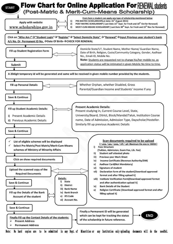 Online Application for renewal of Post-Matric and Merit-cum-Means Scholarship from www.scholarships.gov.in. Please note that No hard copies are to be submitted in any Department of Minorities or any Institutions. Only uploading documents will do the needful.