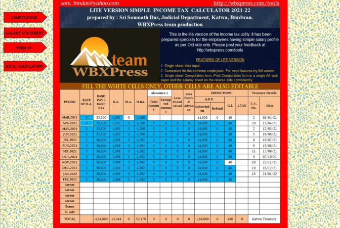 This is the lite version of the Income Tax Utility for the Financial Year 2021-2022. It has been prepared specially for the employees having simple salary profile.