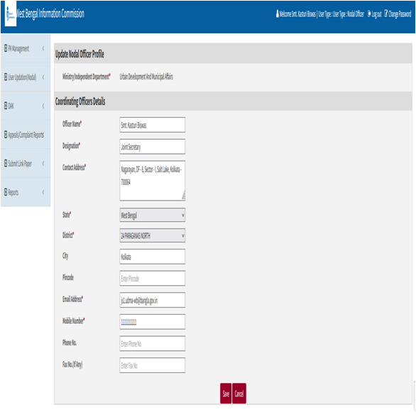 User Updation (Nodal) -> Update Personal details -> Save