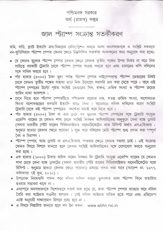 (5) It is learnt from the office of the Collector of Kolkata that the printing of high value stamp papers (Rs. 10,0001- to 25,0001-) have been discontinued by the Government. Registering officers should be more cautious while accepting deeds containing high value stamp papers as the circulation of such stamp papers will come to zero very soon.